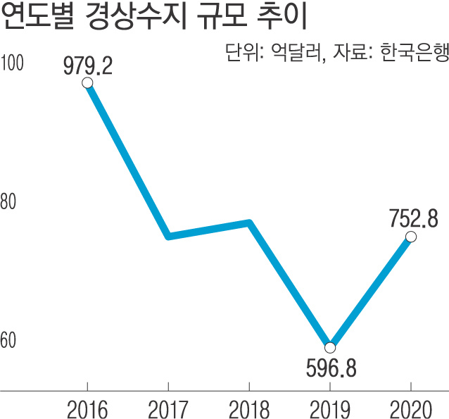상품수지는 유가 하락과 하반기 수출 회복세에 힘입어 흑자폭이 819억5000만달러로 1년 전보다 21억4000만달러 늘었다. 코로나19 사태로 연간 수출(5166억달러)이 2019년보다 7.2% 줄었지만 원유 등 원자재 가격 하락으로 수입(4346억6000만달러) 감소율이 8.8%로 더 높았다.