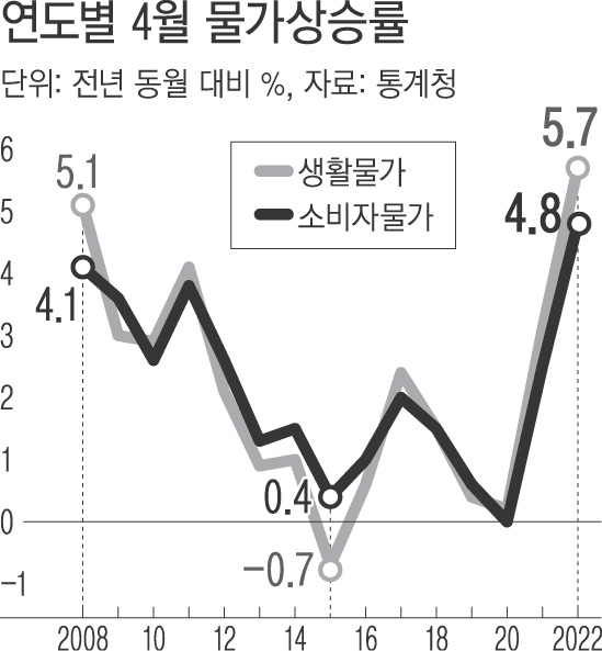 통계청에 따르면 4월 소비자물가지수(106.85, 2020년=100)가 더 상승하지 않고 현 상태를 유지한다 해도 올해 물가 상승률은 3.9%에 이르게 된다.