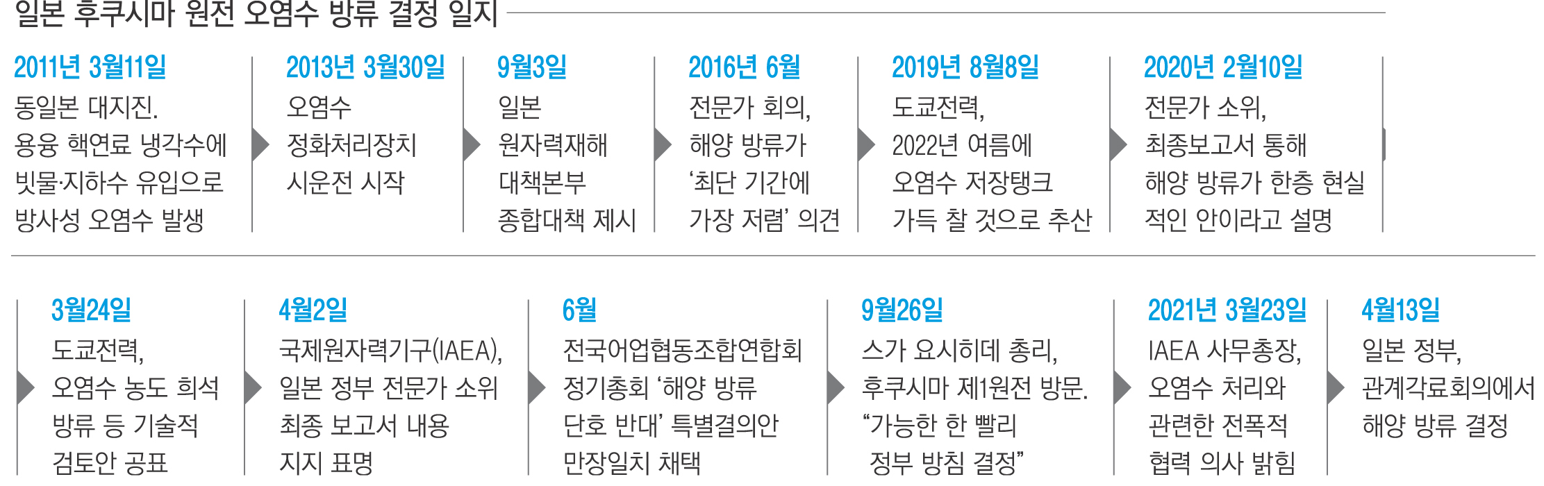 일본 정부는 국내외 반발에도 불구하고 후쿠시마 원전 오염수의 해양 방류를 결정했다.