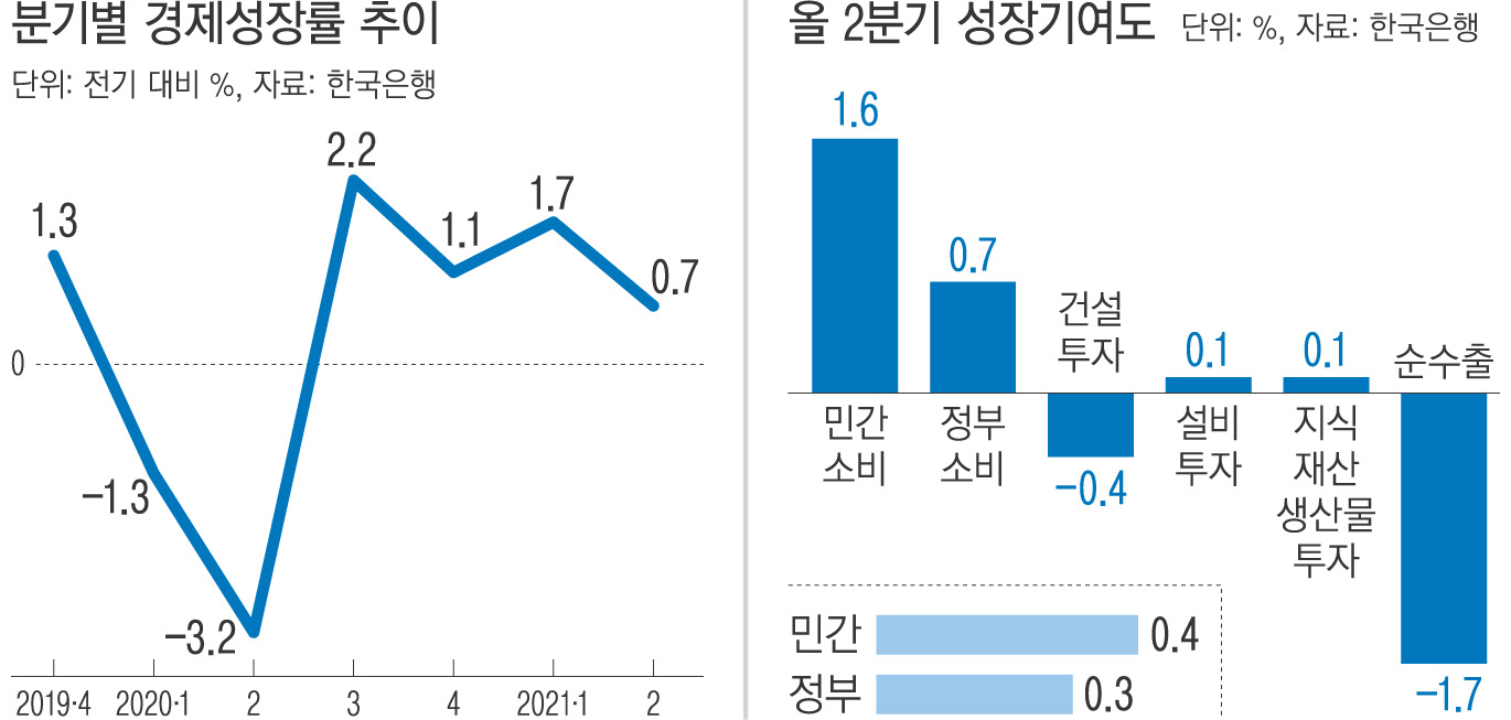 한국 경제가 민간소비의 강한 회복세에 힘입어 올해 2분기 0.7% 성장했다.
