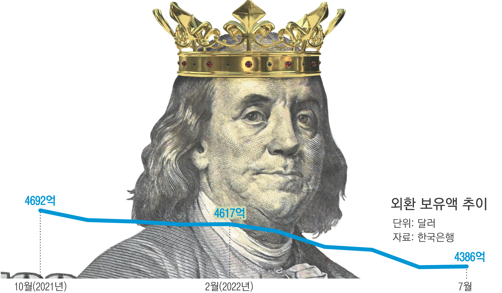 지난해 4692억달러(10월 말 기준)였던 한국 외환보유액은 올해 7월 말 기준 4386억달러로 줄었다.