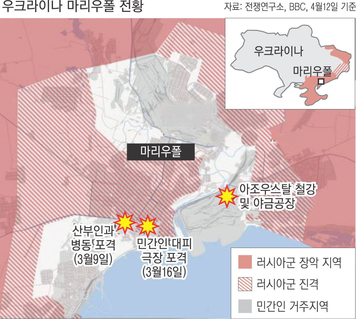 러시아군의 ‘돈바스 대공세’가 예고된 가운데 봉쇄 상태에서 40일 넘게 러시아군의 포격을 당해온 우크라이나 남부 항구도시 마리우폴이 함락 위기에 몰렸다.