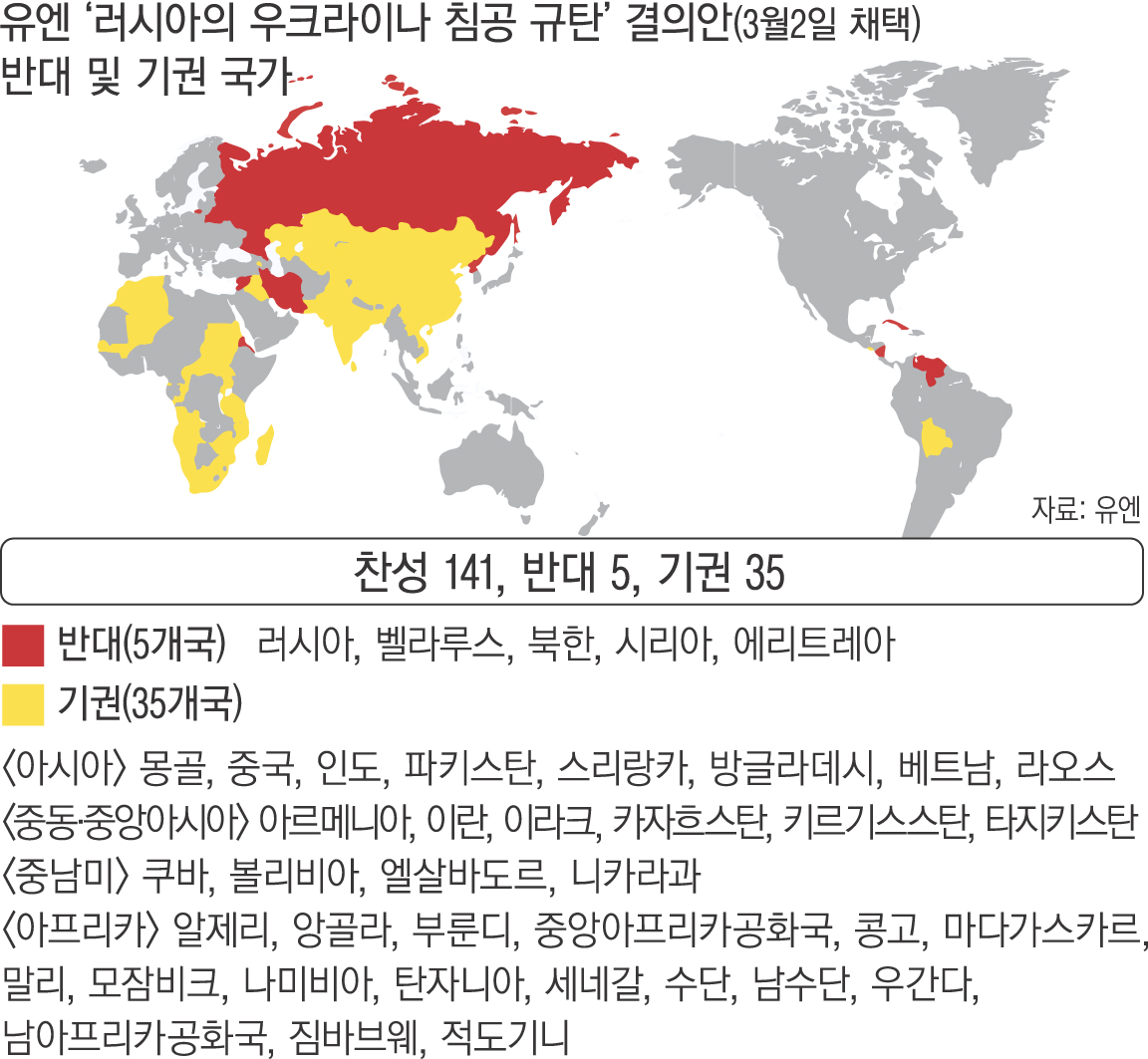 러, 우크라 침공 두고…결속 과시한 미·유럽, 거리 두는 중·인도, 국익 따라 제각각인 중남미