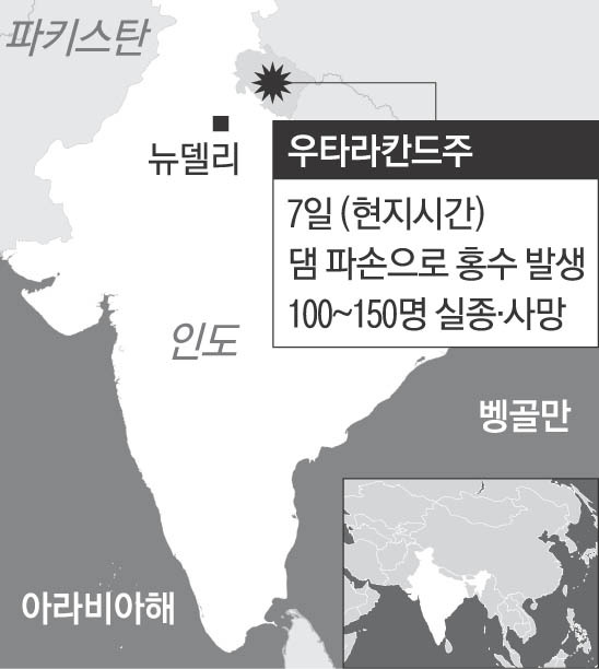인도 북부 우타라칸드주에서 7일 물난리가 일어나 최소 19명이 사망하고 180여명 이상이 실종됐다. 이번 사고는 히말라야산에서 떨어져내린 빙하가 댐을 강타하고 급류가 마을을 휩쓸면서 발생했는데 난개발과 기후변화가 원인이라는 분석이 제기됐다.