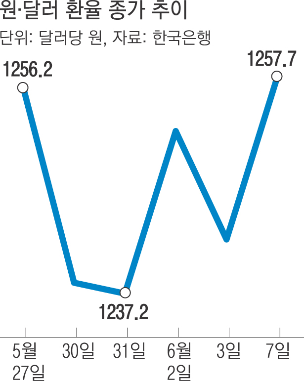 7일 서울 외환시장에서 원·달러 환율은 전 거래일 종가보다 15.0원 오른 달러당 1257.7원에 거래를 마쳤다.