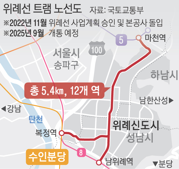 지하철 5호선 마천역에서 8호선 복정역과 남위례역까지 총 5.4㎞를 연결하는 위례선은 2025년 9월
