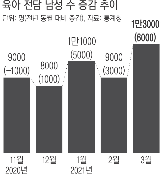육아를 도맡은 남성이 지난달 큰 폭으로 늘며 1만3000명을 기록했다.