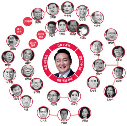 윤 당선자의 검찰 등 법조계 선후배들은 선대본부 내 공식 조직과 ‘서초동 캠프’란 이름의 외곽 조직에서 양면으로 지원했다.