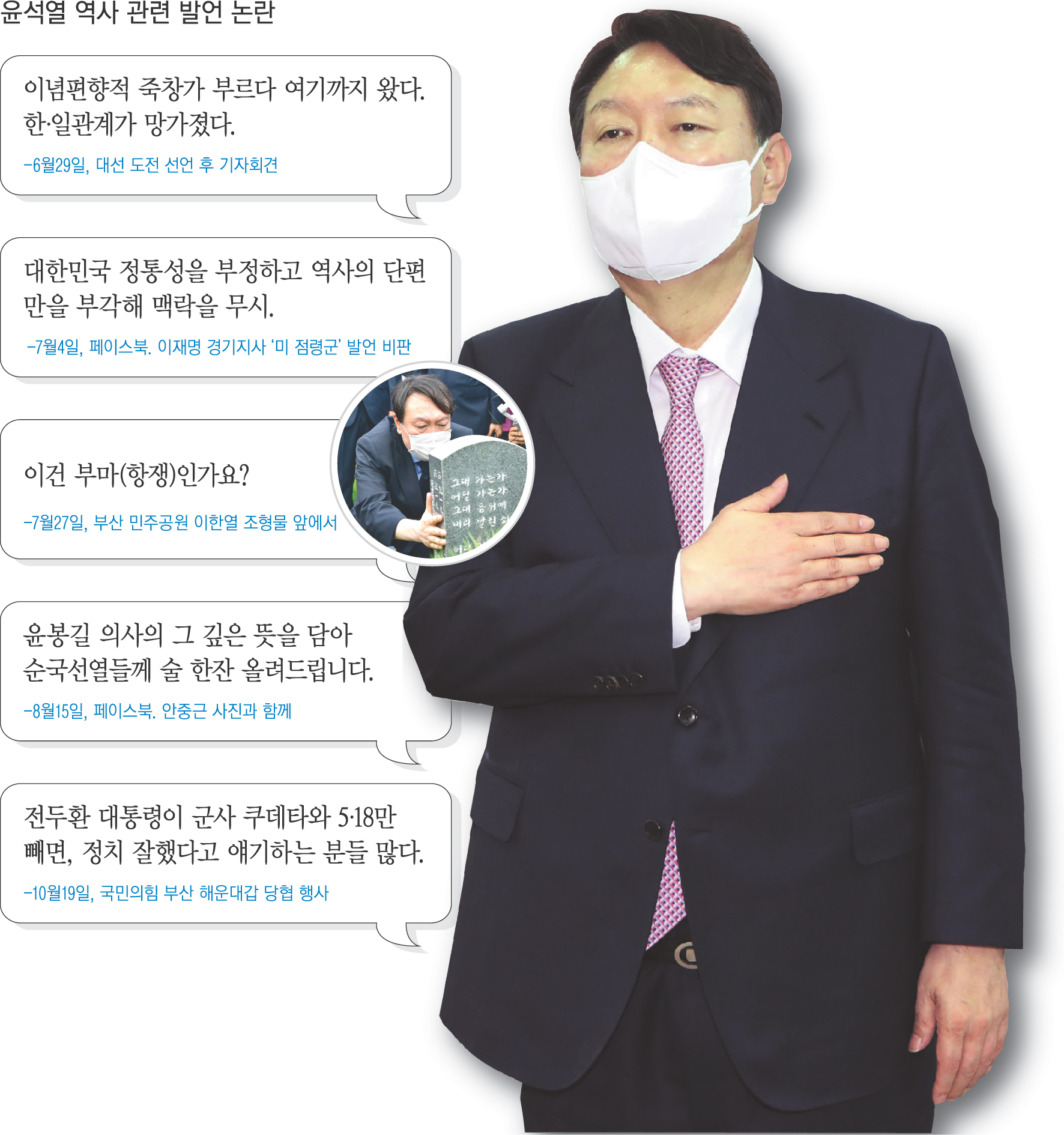 윤 전 총장의 역사 인식 관련 논란이 처음은 아니지만 단순 실수로 넘길 수 있었던 앞선 사례들에 비해 이번 발언은 몰역사적인 인식을 드러냈다는 점에서 파장이 훨씬 더 클 수밖에 없다.