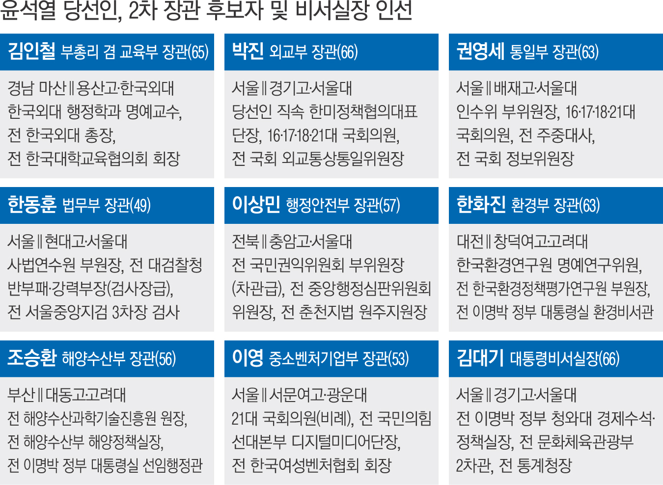측근인 한 내정자를 비롯해 윤 당선인의 충암고-서울대 인맥, 인수위 핵심 인사들이 입각하는 등 함께 일했던 사람을 중용하는 특징이 다시 드러났다.