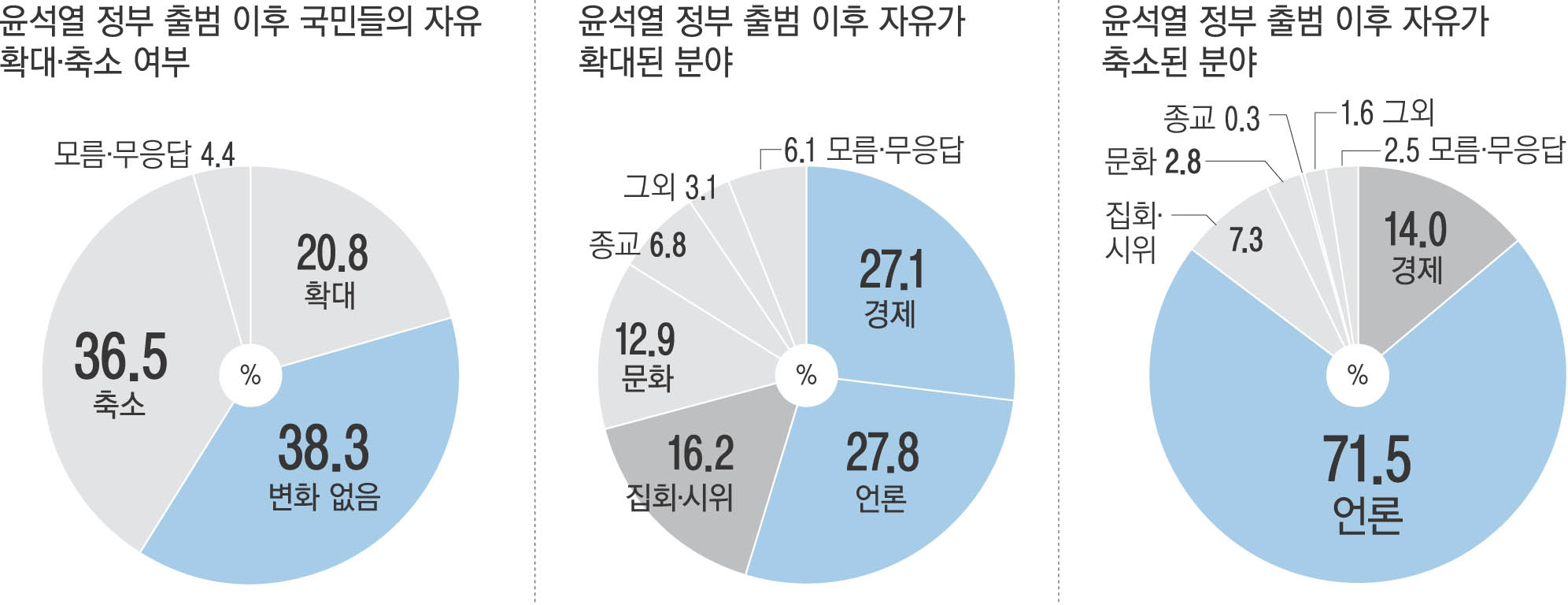 윤석열 대통령 취임 이후 국민들의 자유가 축소되거나 이전과 변함이 없다고 생각하는 이들이