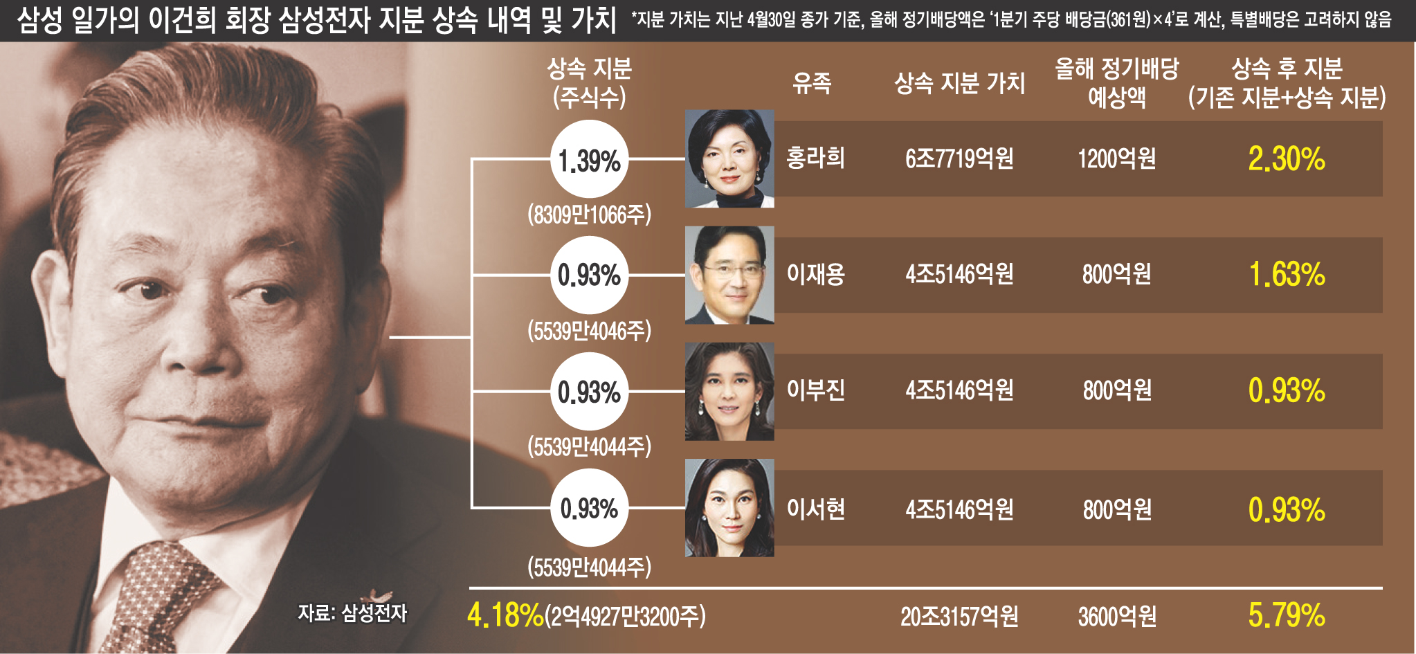 고 이건희 삼성전자 회장의 삼성전자 지분(4.18%)이 법에 정한 비율대로 유족 4명에게 상속됐다.
