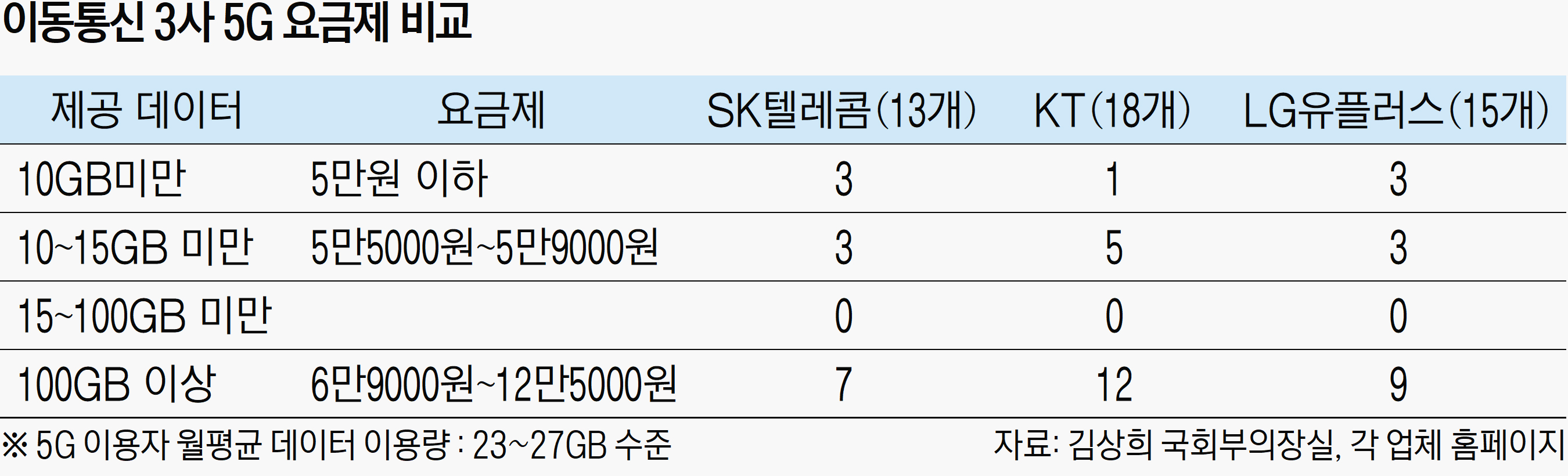 현재 이통3사의 5G 요금제는 데이터 15GB 미만(월 5만5000원 안팎), 100GB 이상(6만9000원 이상)으로 양분화돼 있다.