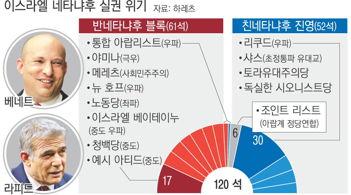 극우 정당 야미나(7석)의 나프탈리 베네트 대표(49)가 제1야당 예시 아티드(17석)가 이끄는 반네타냐후 연정에 참여하기로 결정하면서다.