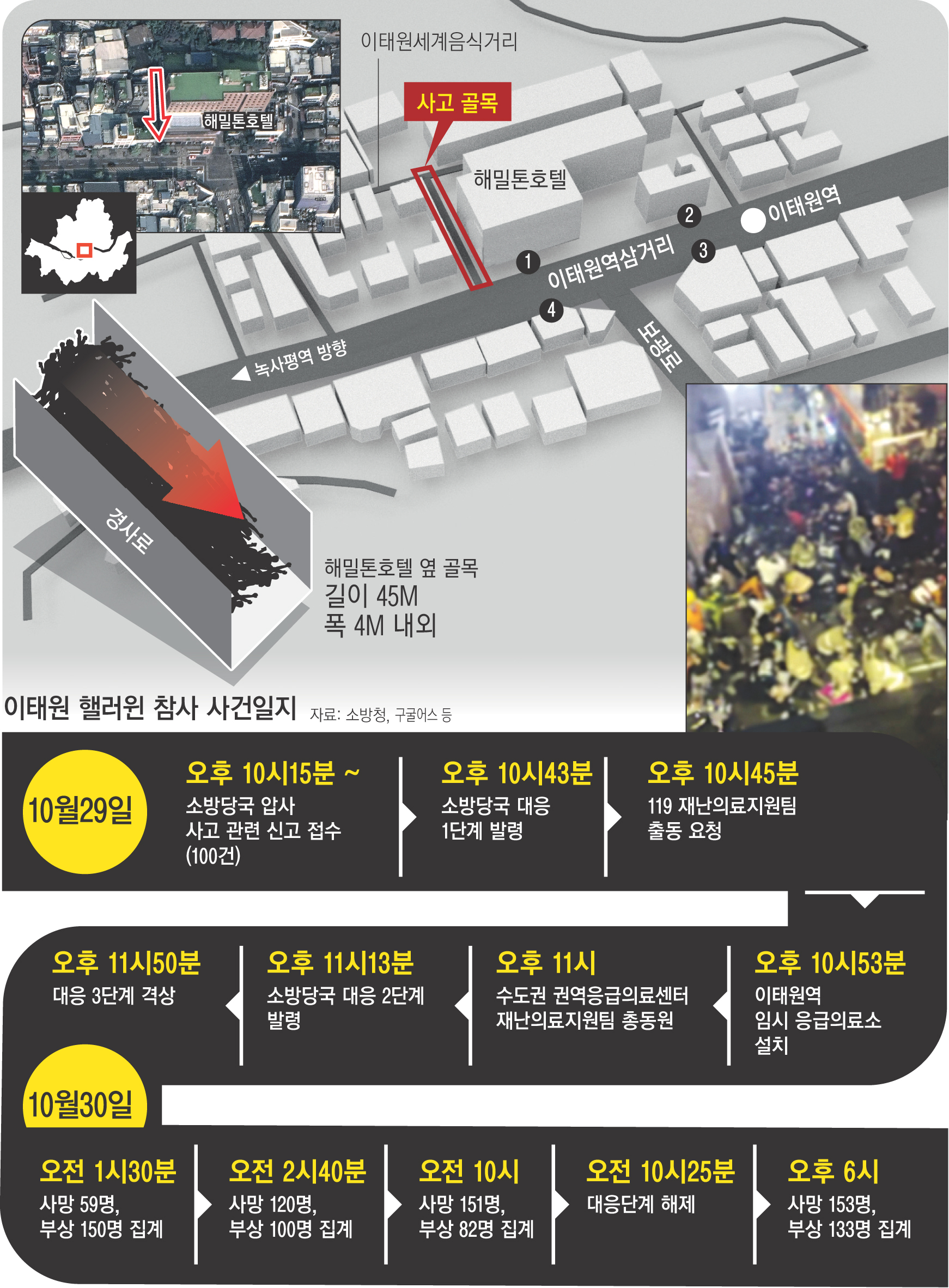 지난 29일 밤 200명 넘는 사상자가 발생한 서울 용산구 이태원동 핼러윈 압사 사고 현장은 아비규환 그 자체였다.