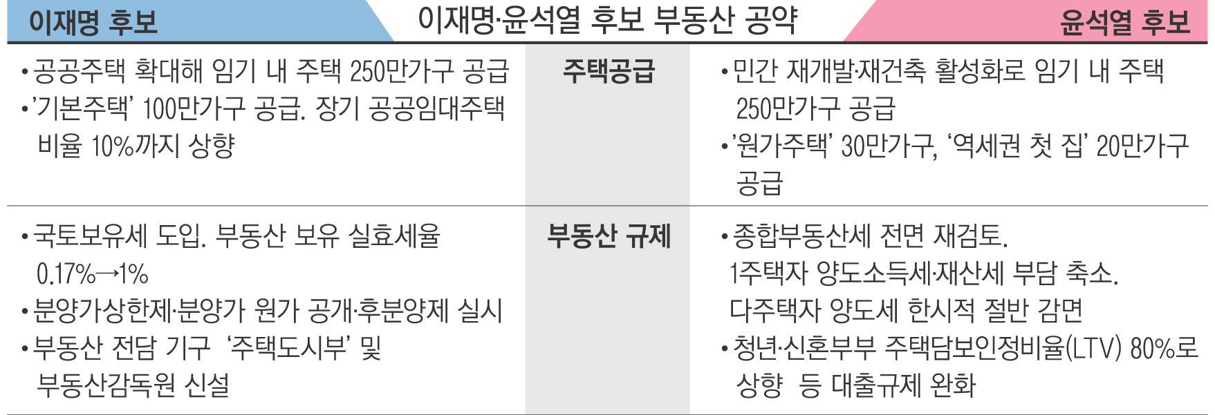 대선 정국의 최대 현안 중 하나로 꼽히는 부동산 분야에서는 두 후보 모두 시장을 안정시키기 위한 ‘공급 확대’를 내걸고 있다.