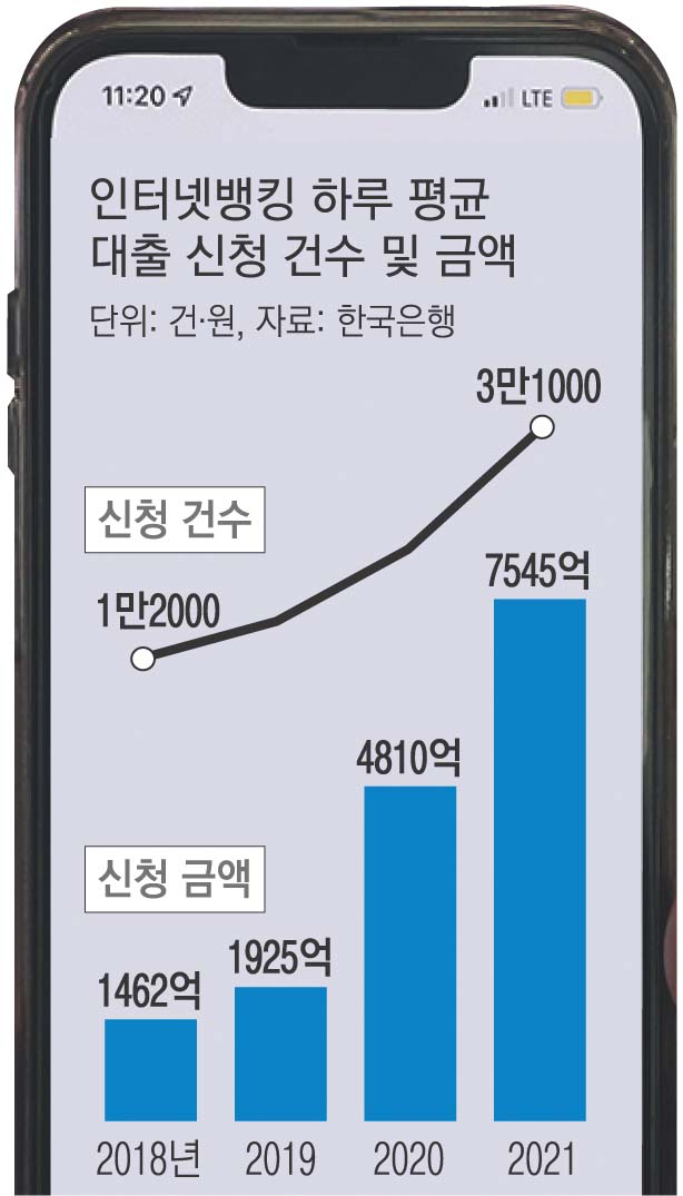 은행 창구에 가지 않고 인터넷뱅킹(모바일뱅킹 포함)을 통한 대출 신청이 지난해 하루 평균 3만1000건, 금액으로는 7500억원 넘게 이뤄진 것으로 나타났다.