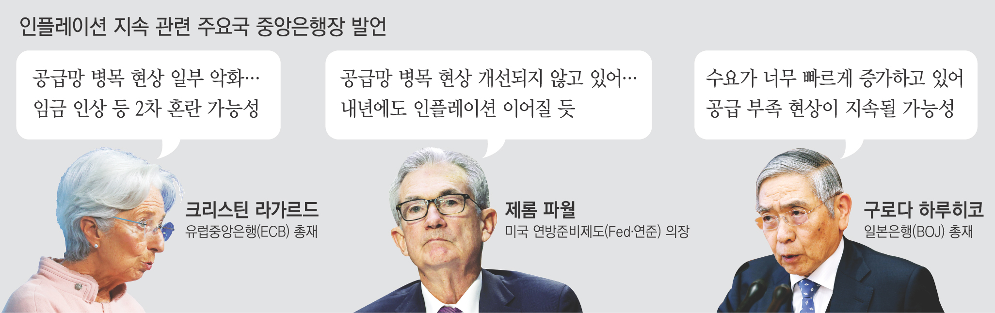 미국, 유럽, 일본 등 주요국 중앙은행 수장들이 일제히 인플레이션이 내년까지 지속될 수 있다고 발언했다.