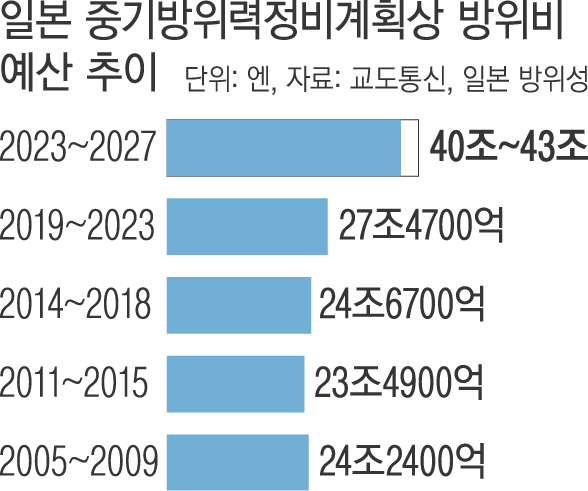 일본 정부가 내년부터 향후 5년 동안 방위비 총액을 43조엔(약 410조4000억원)으로 늘리기로 했지만