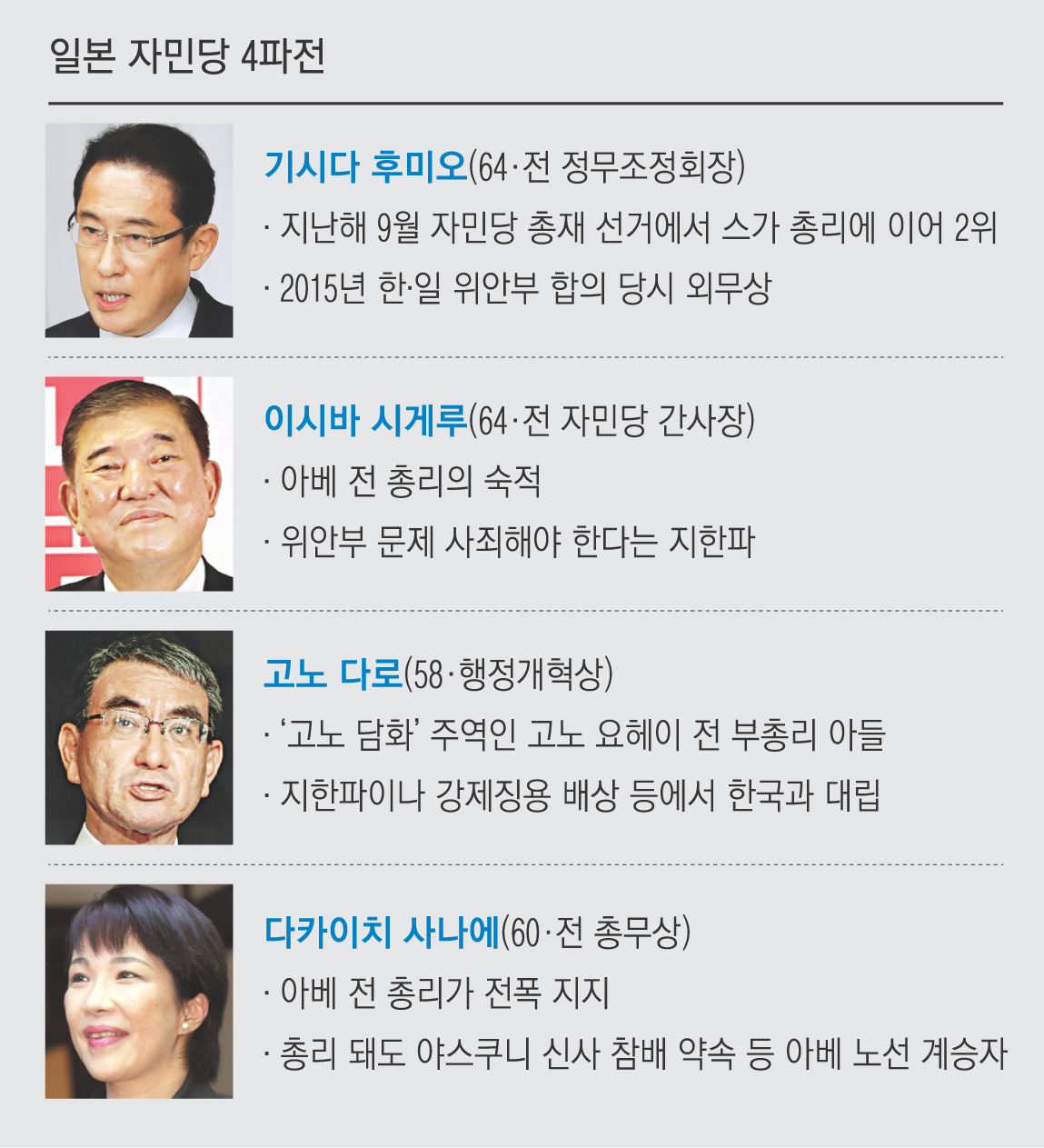 스가 요시히데(菅義偉) 총리의 불출마 선언으로 선거는 4파전 구도로 치러질 것으로 보인다.