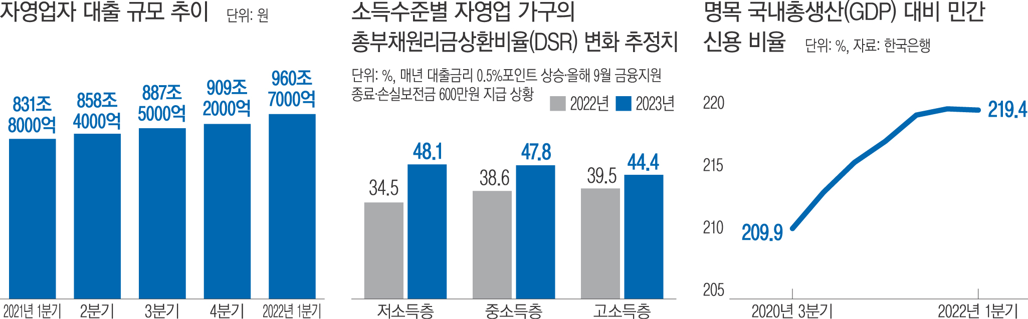 대출 금리가 오르고, 코로나 대응 차원에서 이뤄졌던 각종 금융지원 조치가 종료될 경우 ‘저소득 자영업 가구’의 내년 총부채원리금상환비율(DSR)이 올해보다 14%포인트 뛸 것으로 추산됐다.