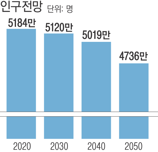 통계청이 26일 발표한 ‘장래인구추계(시·도편) 2020∼2050년’을 보면 총인구는 2020년 5184만명에서 2050년 4736만명으로 448만명 줄어들 전망이다.
