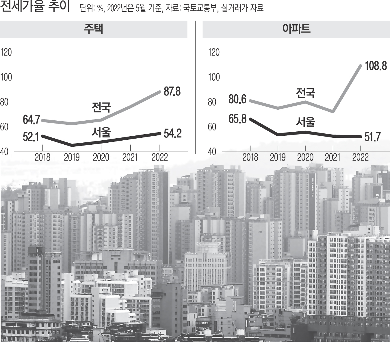 전국 전체 주택의 평균 전세가율은 2020년 65.1%에서 올해 5월 기준 87.8%까지 치솟았다.