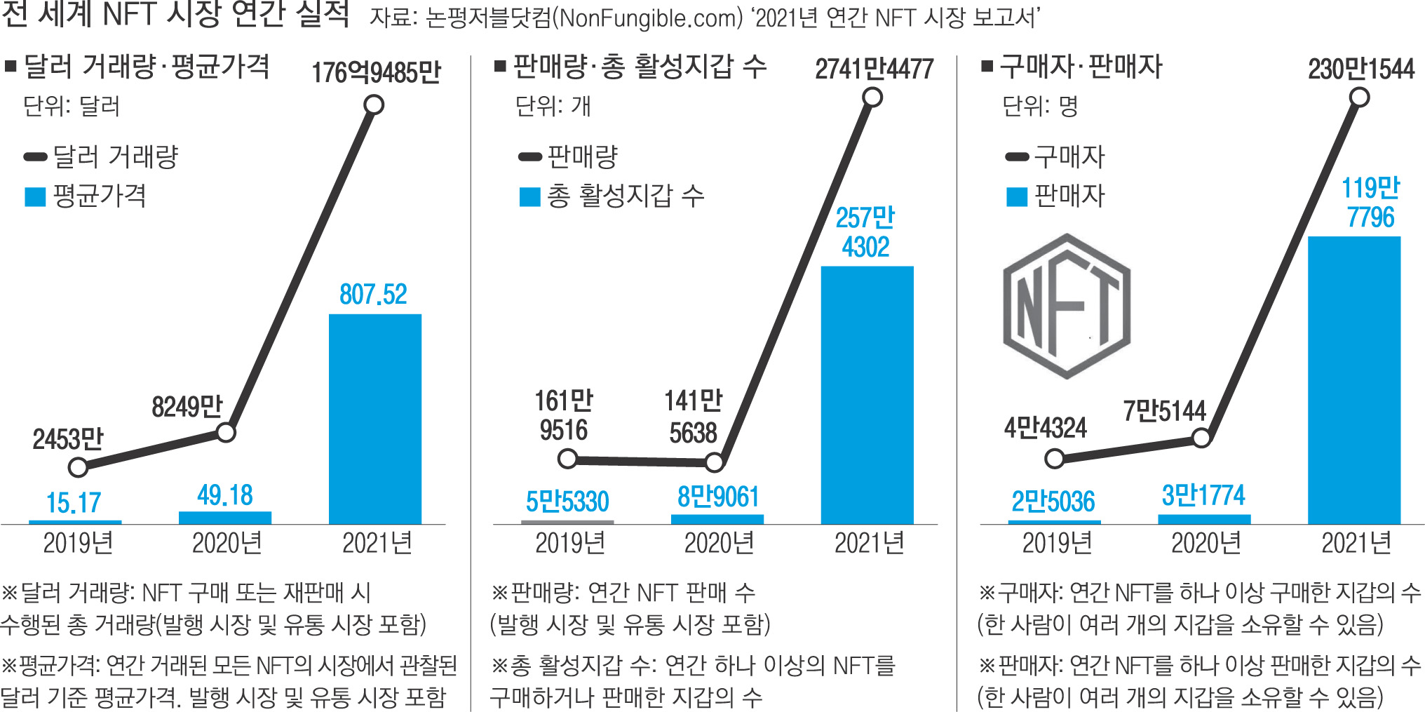 NFT 데이터 분석기업 논펑저블닷컴에 따르면 NFT의 연간 거래량은 2019년 2453만달러(약 300억원)에서 지난해 176억9485만달러(약 21조6000억원)로 급증했다.
