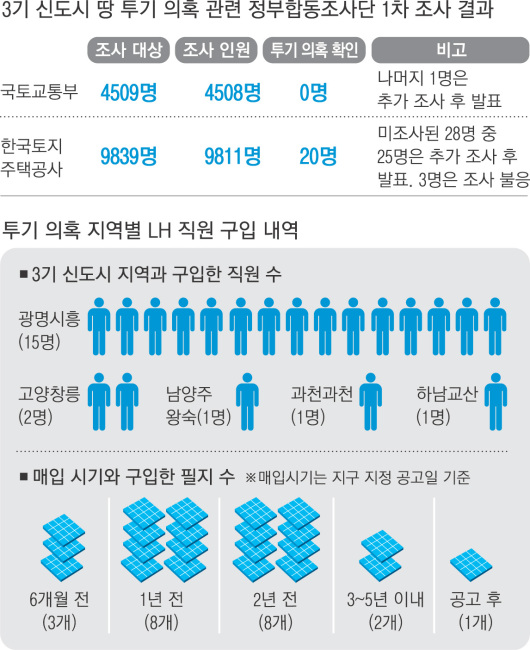국토교통부와 한국토지주택공사(LH) 직원들의 3기 신도시 투기 의혹 관련 정부합동조사단(합조단)의 1차 조사에서 총 20명이 투기 의심 토지거래로 적발됐다.