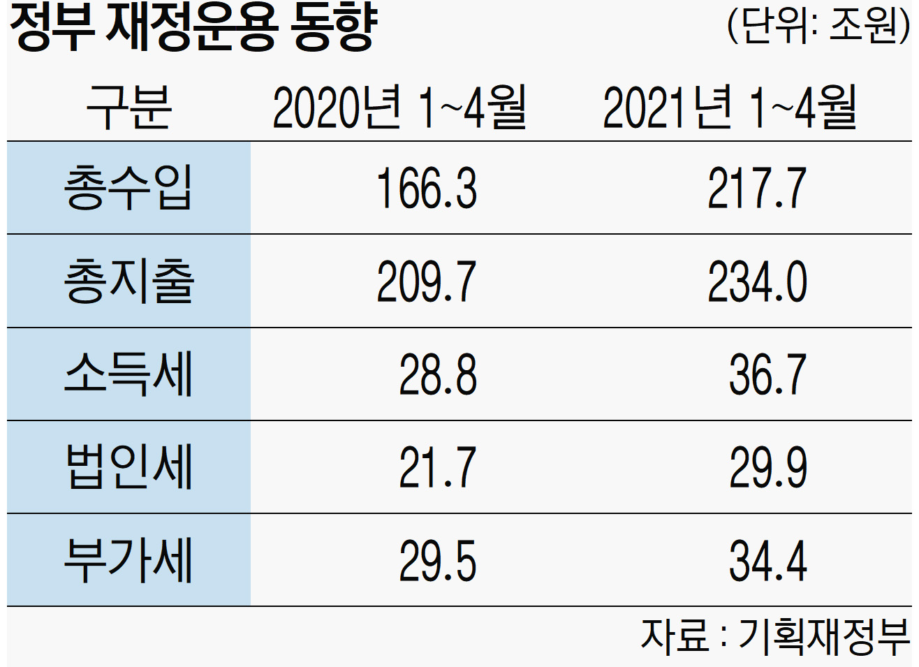 예상보다 경기가 빠르게 회복하면서 올해 1~4월 정부가 거둬들인 국세수입이 1년 전보다 32조7000억원이 늘었다.
