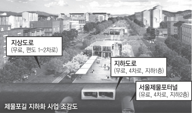이날 오후 2시30분쯤 서울 여의도 전경련회관 앞 여의나루 나들목에서 지하 70m 깊이의 서울제물포터널 공사 현장으로 내려갔다. 오는 4월16일 개통을 앞두고 전기공사, 천장과 벽면 마무리 공사 등이 한창이었다. 일반 터널처럼 반원 형태로 굴착했지만 상층부를 환기구와 화재 시 연기를 빼내는 공간으로 활용하기 위해 천장 높이가 3.5m 정도였다.