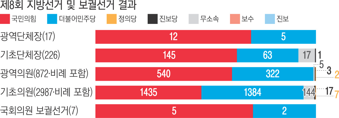 국민의힘은 광역단체장 17곳 중 12곳, 보궐선거 7곳 중 5곳에서 이기며 윤석열 정부 초기 국정 운영 동력을 확보했다.