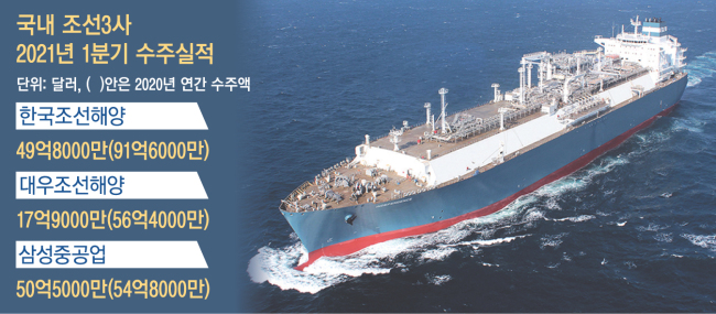 한국조선해양, 대우조선해양, 삼성중공업 등 국내 조선 3사가 최근 잇따라 대규모 고부가가치선 계약을 따내면서 올 1분기 수주액이 지난해 연간 수주액의 절반을 넘어선 것으로 나타났다.
