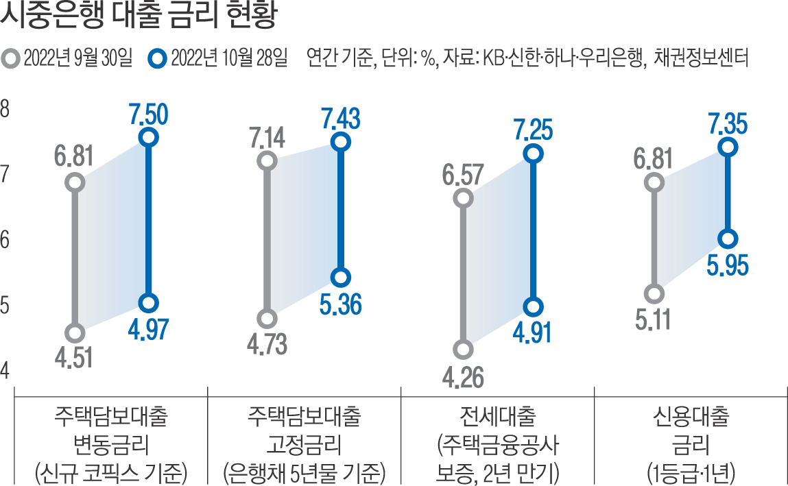 주택담보대출, 전세자금대출, 신용대출 등 시중은행 가계대출 상품의 최고 금리가 연 7%를 넘어섰다.