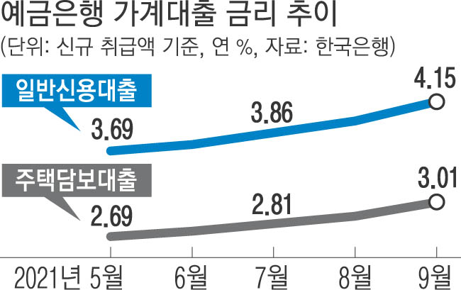 지난달 은행권의 주택담보대출(주담대) 평균 금리가 2년6개월 만에 연 3%대에 진입했다. 신용대출 금리도 4%를 넘어섰다.