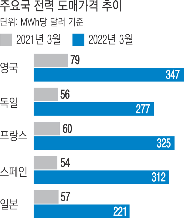 5일 에너지경제연구원에 따르면 영국·독일·프랑스·스페인 등 유럽 4개국과 일본의 지난 3월 전력 도매가격은 전년 동월 대비 평균 388% 상승했다.