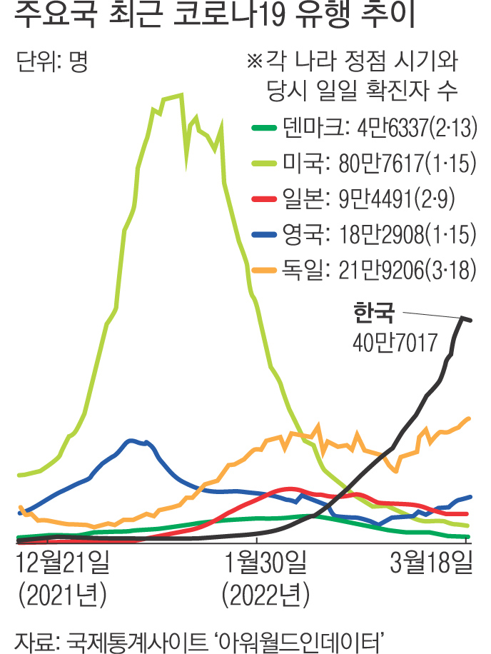 통상 인구의 20~30%가 감염된 후 오미크론 유행이 감소세로 전환한 해외 사례를 볼 때, 한국도 곧 감소세로 전환해 ‘엔데믹’(감염병의 풍토병화)으로 가는 것 아니냐는 기대가 나온다.