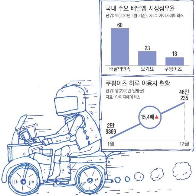 현재 시장점유율 3위지만 쿠팡의 미국 증시 상장으로 확보한 투자금을 실탄으로 1위 업체 배달의민족(배민) 턱밑까지 치고올라올 기세다.