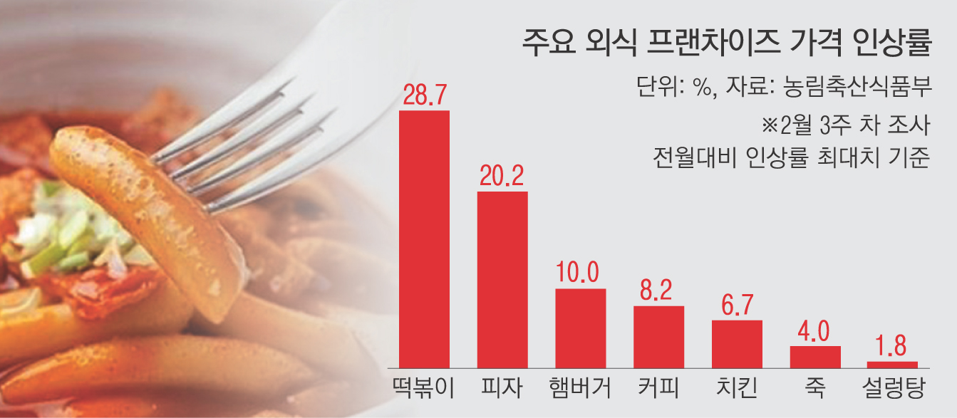 외식 프랜차이즈 업체 25%가 한 달 새 대표 메뉴의 가격을 인상한 것이다.
