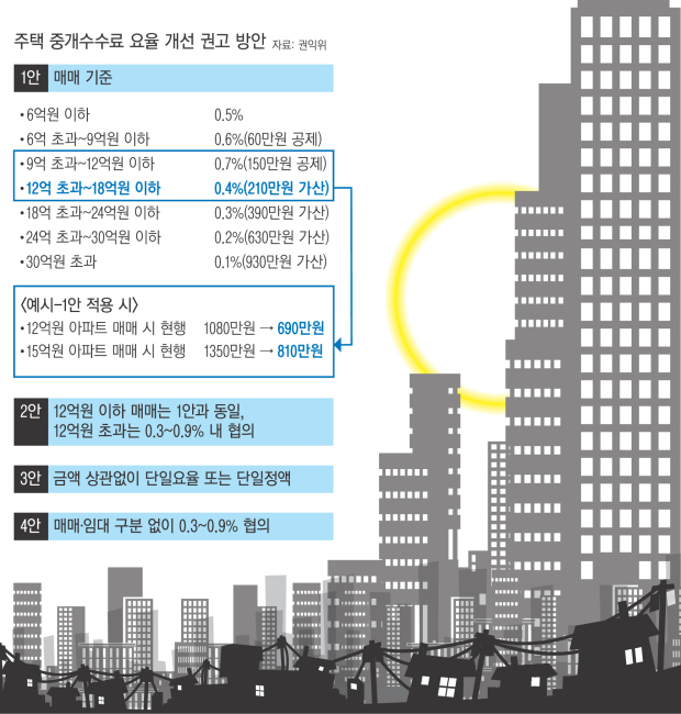 국민권익위원회가 12억원이 넘는 주택의 매매 중개수수료(임대는 9억원 초과)를 낮추는 방안을 9일 국토교통부에 권고했다. 15억원짜리 주택 매매 시 수수료가 현행보다 390만~570만원 낮아지는 방식이다. 국토부는 권고안을 토대로 연구용역을 거쳐 오는 6~7월 최종 개선안을 발표한다.