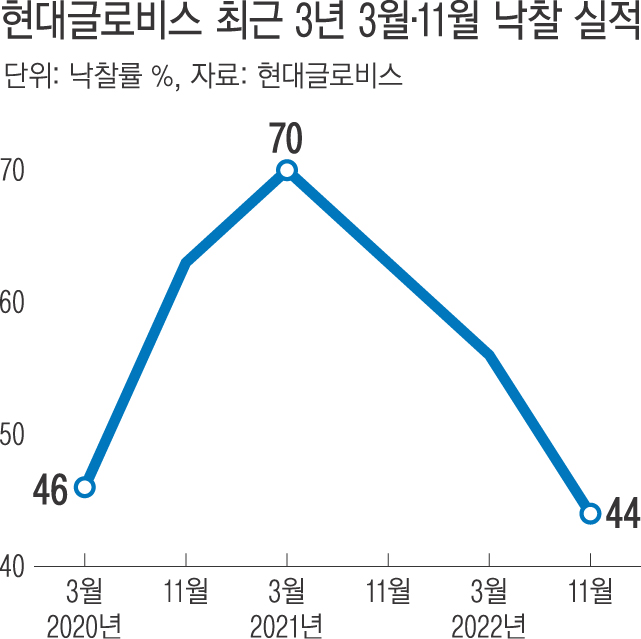 국내 최대 중고차 경매장 운영업체인 현대글로비스의 낙찰률이 2년7개월 만에
