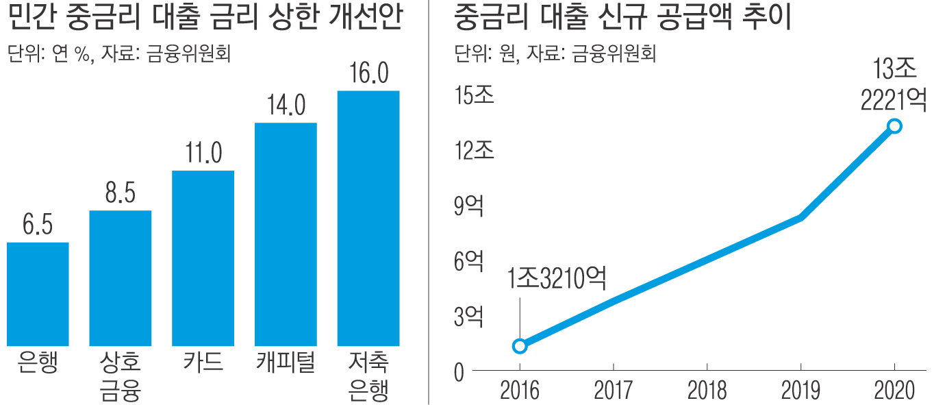 금융당국이 금융권의 중금리 대출 요건을 개편해 공급을 늘리는 방안을 내놨다. 업권별로 중금리 대출 인정 요건을 완화해 해당폭을 넓히고, 금리 상한은 내려 중·저신용층에게 중금리 대출이 집중적으로 공급될 수 있도록 유도하겠다는 방침이다. 인터넷은행으로부터 중금리 대출 확대 계획안도 제출받기로 했다.