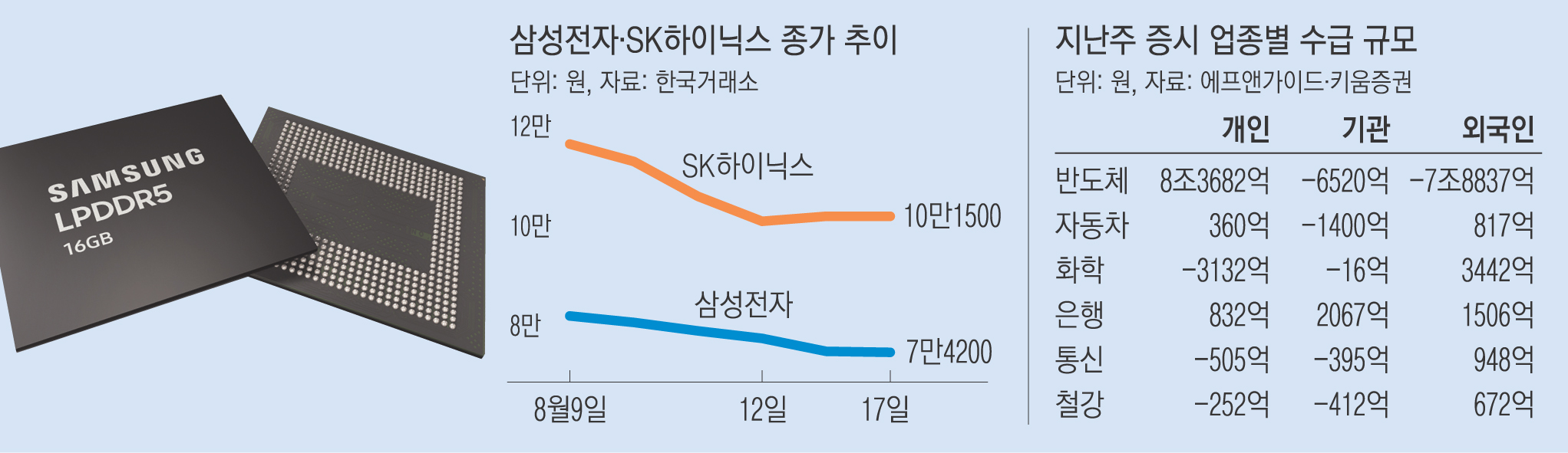 삼성전자와 SK하이닉스 등 반도체주들이 급락하면서 국내 주식시장 전체가 휘청거리고 있다.