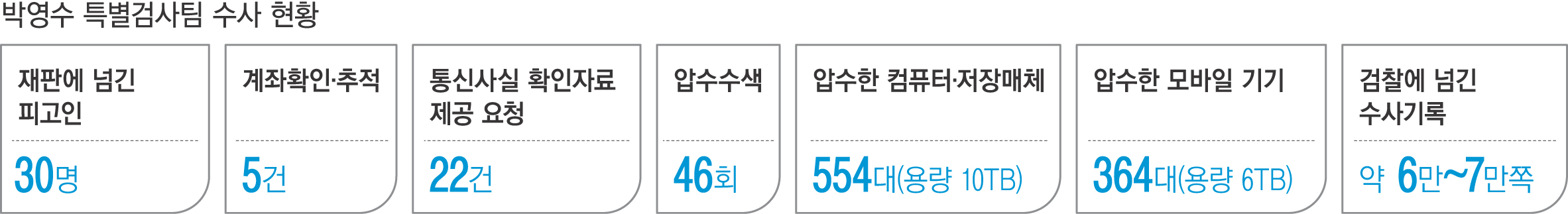 2월 28일 활동을 마무리한 박영수 특별검사팀은 ‘박근혜·최순실 게이트’와 관련, 13명을 구속하고 이들을 포함해 30명을 재판에 넘겼다. 90일(준비기간 20일 포함) 동안 110여명의 수사인력을 투입해 조사한 결과다. 특검 수사로 박근혜 대통령에게는 삼성에서의 뇌물수수와 문화예술계 블랙리스트 시행, 문화체육관광부 공무원 부당 인사 등 3개 혐의가 추가됐다. 검찰 단계에서 적용된 8개를 포함하면 박 대통령의 혐의는 11개로 늘었다.