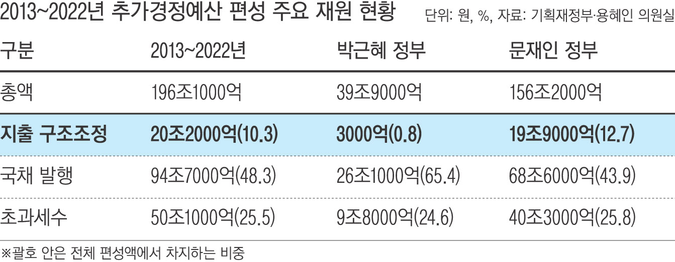 박근혜·문재인 정부에서 편성된 추가경정예산(추경)에서 지출 구조조정을 통해 재원을 마련한 비중은 전체의 10% 수준에 그친다는 분석 결과가 나왔다.