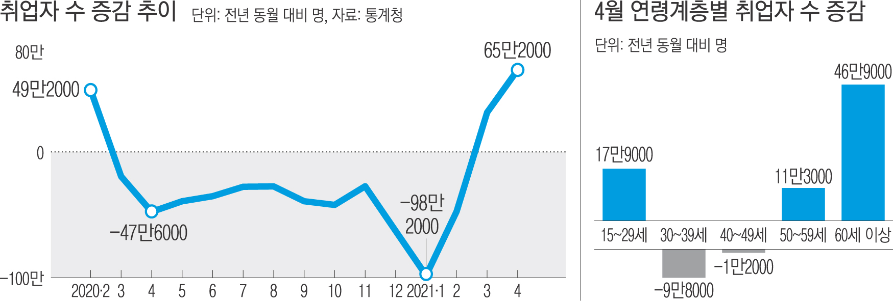 지난달 취업자 수가 65만명 넘게 늘며 수출과 내수에 이어 고용도 회복세에 접어들고 있다는 기대감이 커지고 있다.