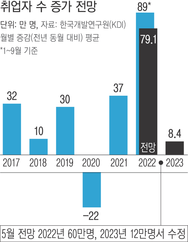 지난 5월 경제전망 발표 때는 취업자 수가 올해 60만명, 내년 12만명 증가할 것으로 예상했는데, 올해 전망치는 높이고 내년 전망치는 낮췄다.