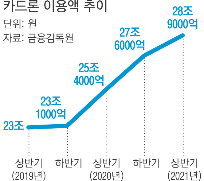 올 상반기 카드론 이용액이 28조9000억원으로 지난해 같은 기간보다 14%나 증가한 것으로 집계됐다.