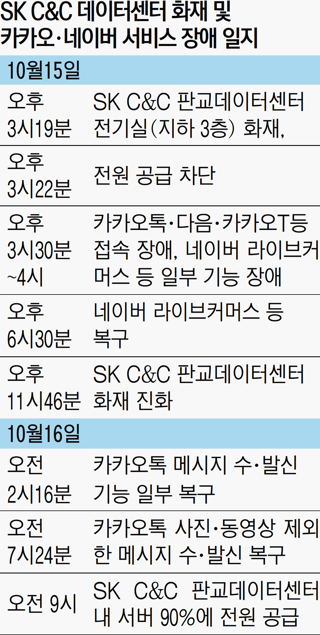 카카오가 지난 15일 경기 판교시의 데이터센터 화재로 카카오톡을 비롯한 핵심 서비스들이 접속 장애 등을 일으켰으나 16일 오후까지 62%만 겨우 복구하는 등 큰 차질을 빚었다.