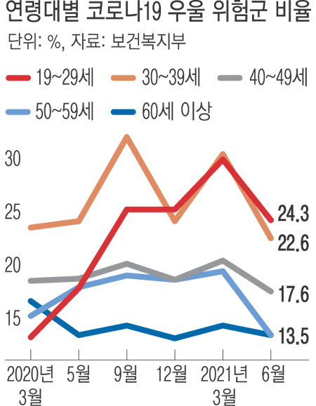 보건복지부의 코로나19 국민 정신건강 실태조사에 따르면 코로나19로 인한 우울 위험군 비율이 가장 높은 연령대가 2030세대이다.